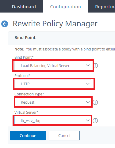 If an incoming request matches a rewrite policy, the policy’s associated action is performed. Rewrite policies for evaluating HTTP requests and responses can be bound to HTTP or SSL virtual servers, or to the REQ OVERRIDE, REQ DEFAULT, RES OVERRIDE, and RES DEFAULT bind points. TCP rewrite policies can only be bound to virtual servers of type TCP or SSL TCP, or to the bind points OTHERTCP REQ OVERRIDE, OTHERTCP REQ DEFAULT, OTHERTCP RES OVERRIDE, and OTHERTCP RES DEFAULT.